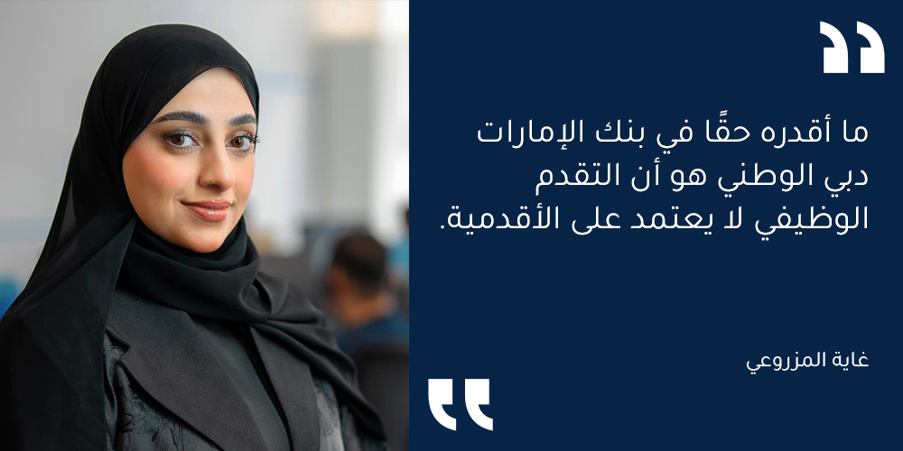 أعتبر هذه التجربة بمثابة منحنى تعليمي كبير، سواء من الناحية التقنية في مجال تكنولوجيا المعلومات أو من ناحية القيادة، لكنّي استمتعت بكل لحظة فيها. كما أنني أقدّر في بنك الإمارات دبي الوطني أن التقدم الوظيفي لا يعتمد على الأقدمية، وأن الفرص المتاحة هنا لا مثيل لها، خاصة للمواطنين الإماراتيين الذين يظهرون نتائج ملموسة.