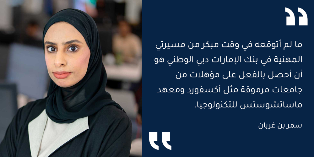ما لم أتوقعه في وقت مبكر من مسيرتي المهنية في بنك الإمارات دبي الوطني هو أن أحصل بالفعل على مؤهلات من جامعات مرموقة مثل أكسفورد ومعهد ماساتشوستس للتكنولوجيا. تحديدًا، من خلال برنامجنا الرائع للتكنولوجيا المستقبلية، حصلت الآن على مؤهلات من كلية سعيد لإدارة الأعمال بجامعة أكسفورد، مع التركيز على استراتيجية البلوك تشين والذكاء الاصطناعي. شهاداتي من معهد ماساتشوستس للتكنولوجيا هي في هندسة البرمجيات وتطوير العمليات السحابية (Cloud DevOps.)، وهو نوع الفرص التعليمية الاستثنائية التي يقدمها بنك الإمارات دبي الوطني منذ اليوم الأول.