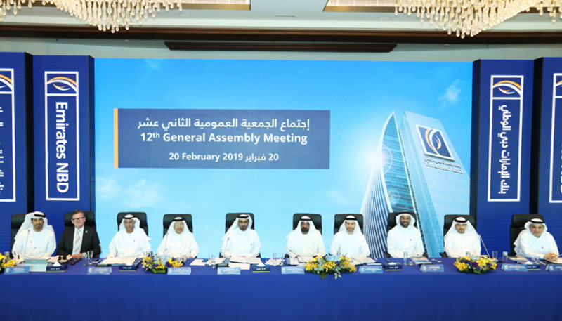 دبي، 20 فبراير 2019: عقد بنك الإمارات دبي الوطني المجموعة المصرفية الرائدة في المنطقة، اجتماع جمعيته العمومية الثاني عشر في المقر الرئيسي للبنك.